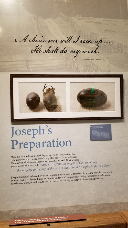 The other instrument, which Joseph Smith discovered in the ground years before he retrieved the gold plates, was a small oval stone, or “seer stone.” As a young man during the 1820s, Joseph Smith, like others in his day, used a seer stone to look for lost objects and buried treasure. As Joseph grew to understand his prophetic calling, he learned that he could use this stone for the higher purpose of translating scripture.[2]