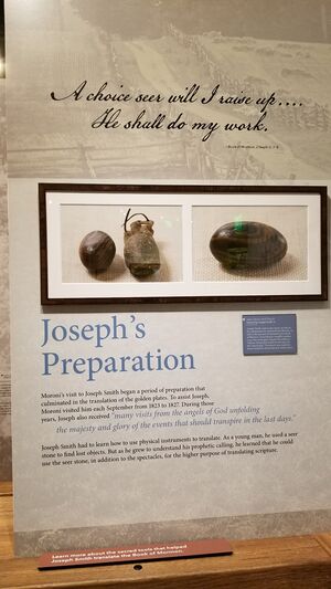 The other instrument, which Joseph Smith discovered in the ground years before he retrieved the gold plates, was a small oval stone, or “seer stone.” As a young man during the 1820s, Joseph Smith, like others in his day, used a seer stone to look for lost objects and buried treasure. As Joseph grew to understand his prophetic calling, he learned that he could use this stone for the higher purpose of translating scripture.[1]