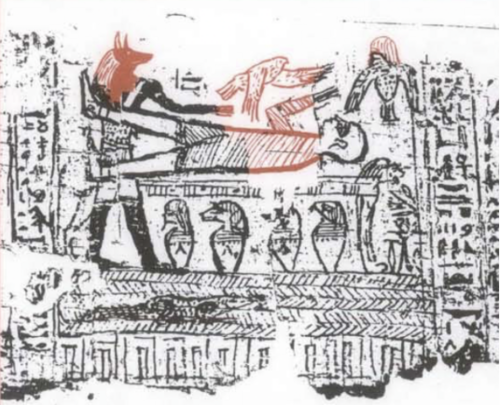 The head of the priest in the Hedlock restoration appears to merely copy the head of the reclining figure. An examination of the papyrus, however, shows evidence that the head was originally that of Anubis. In this case, the Larson restoration appears to be correct. Theologically, it would not matter to scenes such as this one. Ancient art depicting religious situations such as this frequently featured other people impersonating gods. Thus, even if this is an incorrect restoration, it would not matter to the overall message of the scene portrayed.