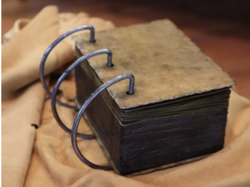 Critics have asked how the Book of Mormon plate text could have fit on the plates given the plates' dimensions. The plates were consistently described by witnesses as “about 8 inches in length, 6 or 7 inches in width, and 4 or 6 inches in depth, with the appearance of gold.”[2] There was a large portion of the plates that was sealed. Only about an inch of loose plates was available for Joseph Smith to translate. Below is a replica of the plates. The darker portion is the sealed portion while the lighter and looser portion is what Joseph Smith translated.