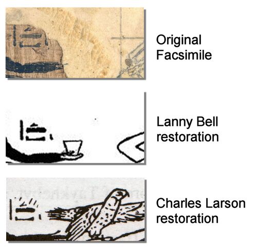 Since Facsimile 1 appears to be a fairly typical scene from Egyptian funerary texts, it is noted that other similar Egyptian motifs do not show the priest holding a knife. A proposed restoration of Facsimile 1 by egyptologist Lanny Bell, for example, shows the priest holding a cup in his hand over the figure on the lion couch.