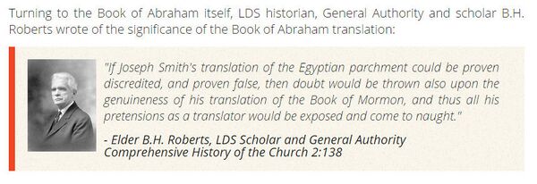 “If Joseph Smith's translation of the Egyptian parchment could be proven discredited, and proven false, then doubt would be thrown also upon the genuineness of his translation of the Book of Mormon, and thus all his pretensions as a translator would be exposed and come to naught.” – Elder B.H. Roberts, LDS Scholar and General Authority, Comprehensive History of the Church 2:138