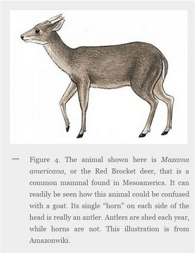 It has already been indicated that a referenced animal in the Book of Mormon could actually be something somewhat different, but had a similar appearance. There is an animal now living in Mesoamerica that fits this description, the Red Brocket deer, Mazama americana. Unlike other deer it has but a single goat-like horn – which is really an antler that is shed and regrown annually like other cervids. [3]
