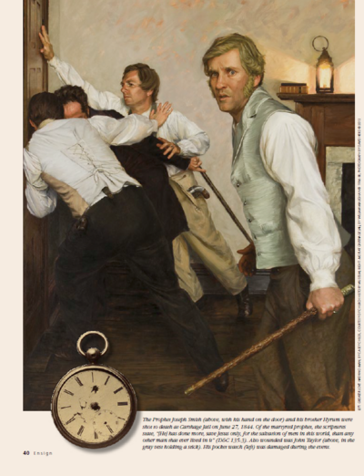 This was a providential circumstance, as most other persons had been very rigidly searched. Joseph then handed the single barrel pistol, which had been given him by John S. Fullmer, to his brother Hyrum, and said, "You may have use for this." Brother Hyrum observed, "I hate to use such things, or to see them used." "So do I," said Joseph, "but we may have to, to defend ourselves;" upon this Hyrum took the pistol. [i]Although it was referred to as a "six shooter," the pepper-box pistol was not a revolver in the normal sense. It incorporated six individual barrels, it was difficult to aim and tended to be unreliable. The June 2013 Ensign features a painting Greater Love Hath No Man, by Casey Childs. [ii] The artwork features all three items in the display case. Joseph, Hyrum and Willard Richards are attempting to hold the door shut as the mob attempts to enter the room. John Taylor is holding his walking stick. In Hyrum’s left pocket is the single shot pistol brought into the jail by Fullmer, and in Joseph’s left pocket, clearly visible, is the pepper-box pistol given to him by Wheelock.