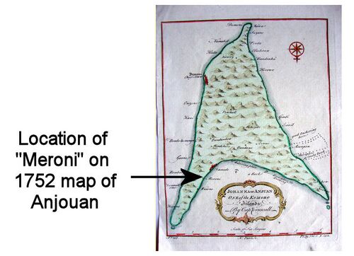 There is also 1748 map done by Frenchman Jacque-Nicolas Bellin of the island of Joanna with the names "Comore" and "Meroni" on it.
