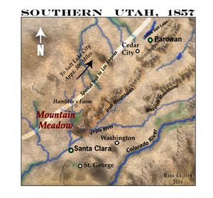 The Mormon settlements of Utah provided important rest and reprovisioning points for overland travelers. One of the most widely used wagon trails to California branched off the Oregon trail in Northern Utah, running almost due South through Salt Lake City, eventually joining the Old Spanish Trail. Emigrants could purchase foodstuffs and other supplies from businesses in Salt Lake City and other towns, while their animals—both beasts of burden and any livestock—could find excellent grazing at a spot near the west end of the Pine Valley Mountains, about 30 miles west of Cedar City and 28 miles north of St. George, known as las Vegas de Santa Clara or the Mountain Meadows. It was common for emigrant parties to camp there for several days or even weeks while their animals gained condition for the grueling desert crossings still to come.